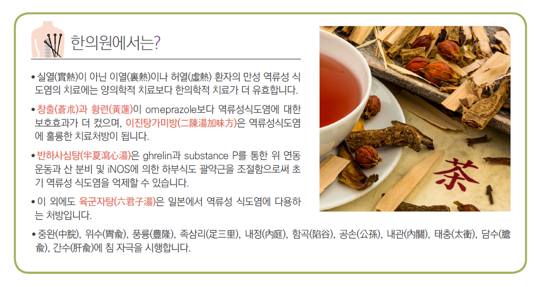 2) 식이 요법으로는 하부식도 괄약근의 압력을 낮추는 기름진 음식, 술, 담배, 커피, 홍차, 박하, 초콜릿 등을 삼가는 것이 좋습니다. 다른 질병의 치료에 사용되는 칼슘통로차단제, 수면제, 통풍 약 등은 하부식도 괄약근 압력을 낮추기 때문에, 다른 약제로 바꾸는 것이 좋습니다.