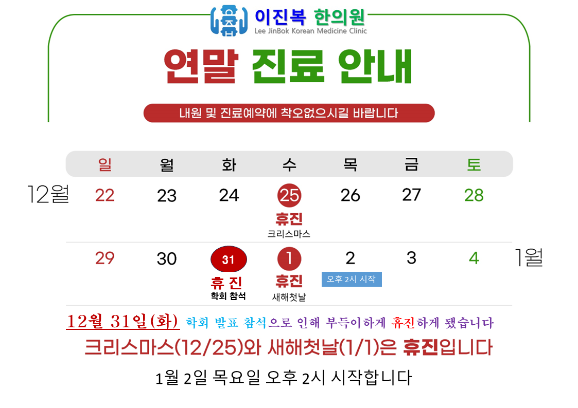 부득이하게 학회 참석으로 12월 31일 휴진 예정이오니 내원 및 예약에 착오 없으시기 바랍니다.
