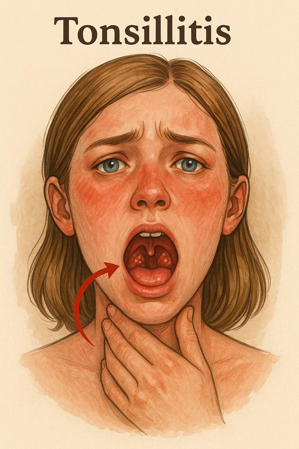 □ 편도가 부분적으로 흰색 또는 노란색 삼출액으로 덮여 있는 것을 확인할 수 있습니다.