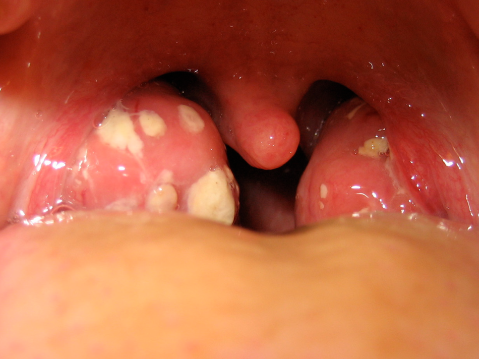 □ 편도가 부분적으로 흰색 또는 노란색 삼출액으로 덮여 있는 것을 확인할 수 있습니다.