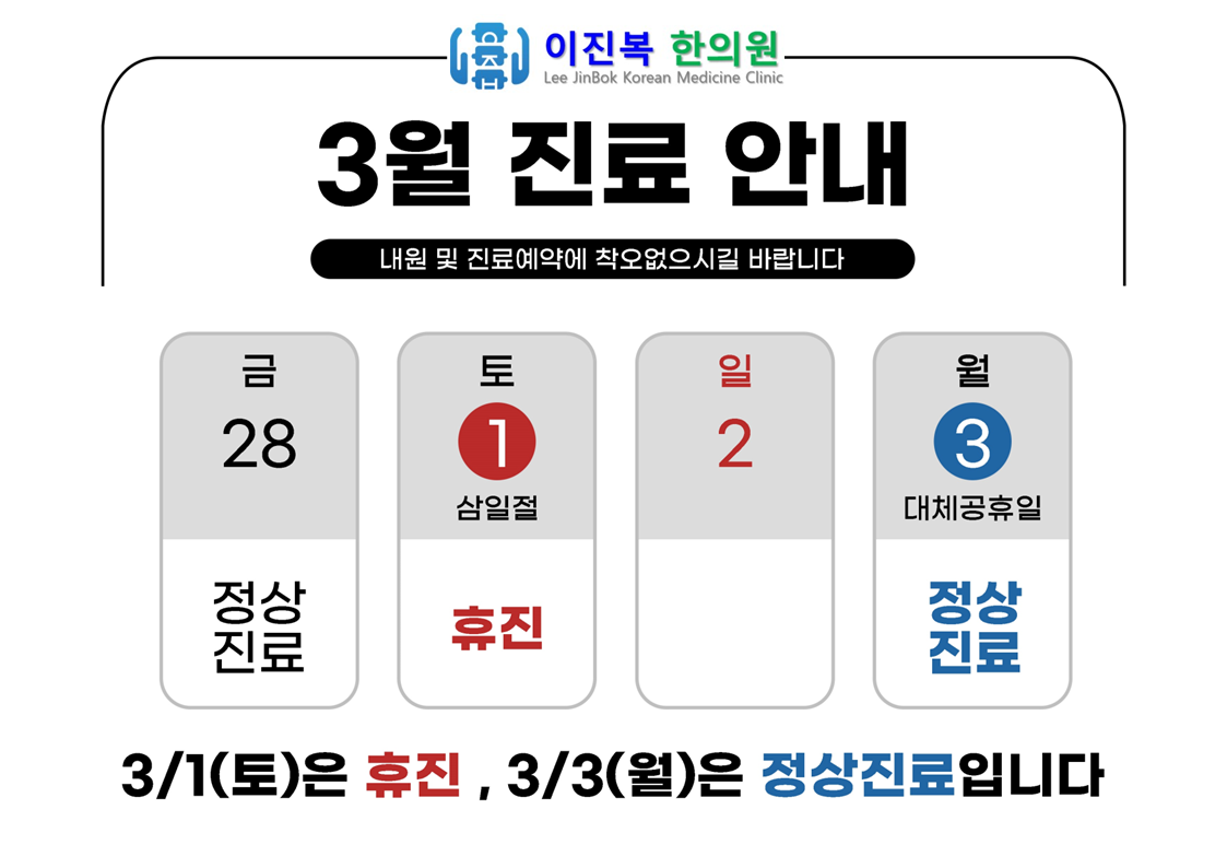 3월1일(토)은 휴진, 3월 3일(월)은 정상 진료(야간) 합니다.