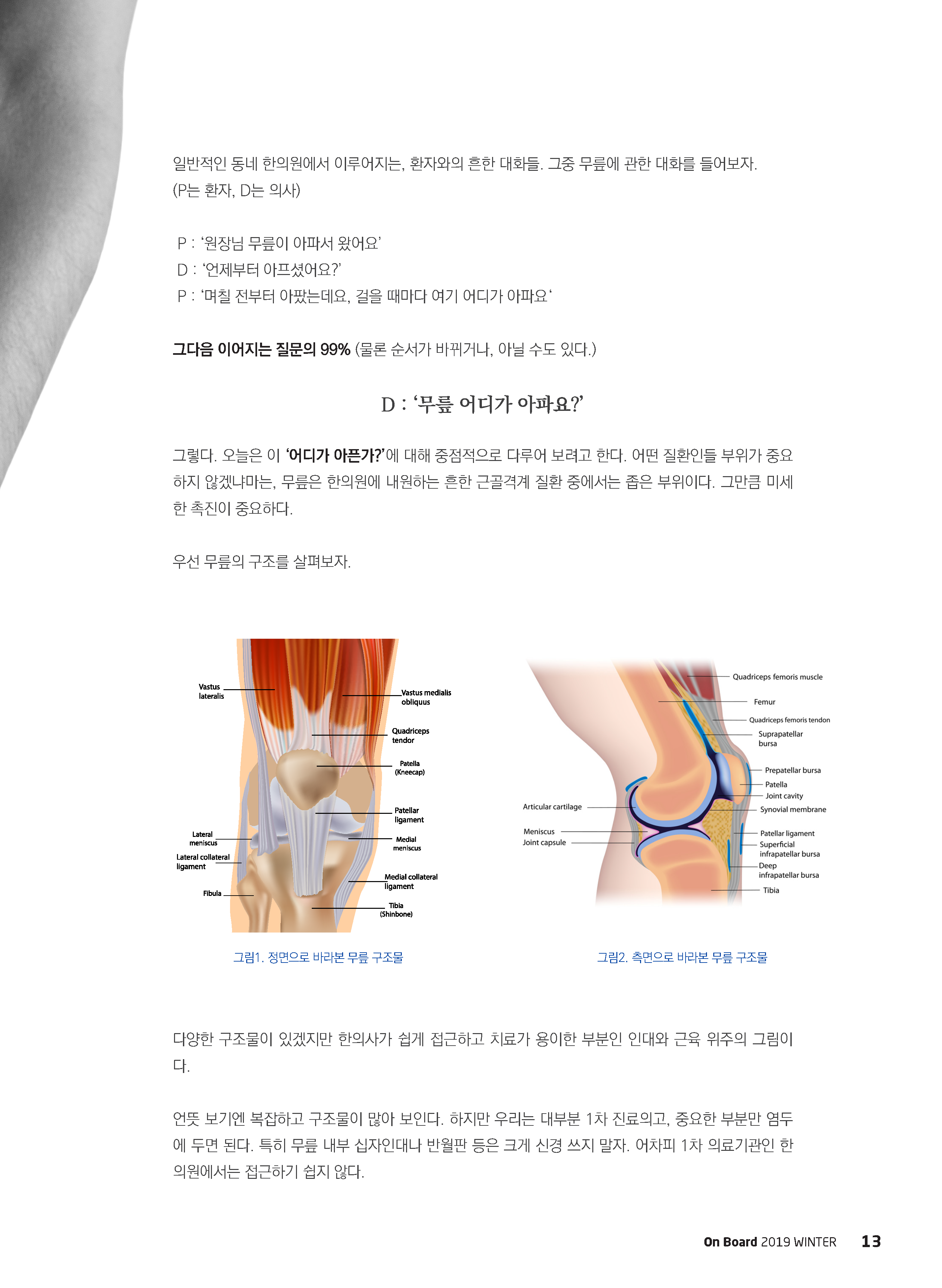 무릎의 구조물이 복잡합니다. 또한 치료에 있어서도 정확한 진단이 필요합니다.