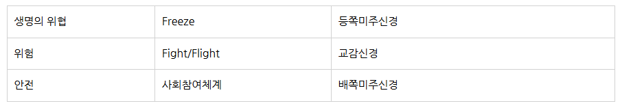 생물의 진화과정에서 나타난 신경계의 발달 과정을 설명하는 이론으로 기존의 교감, 부교감의 대립적인 체계가 아니라 세가지 경로로 구성된 위계적 시스템 작용에 해당하며, 새로 생겨난 미주신경이 이전의 신경회로를 조절하고 억제하는 반응이 나타난다는 이론입니다.