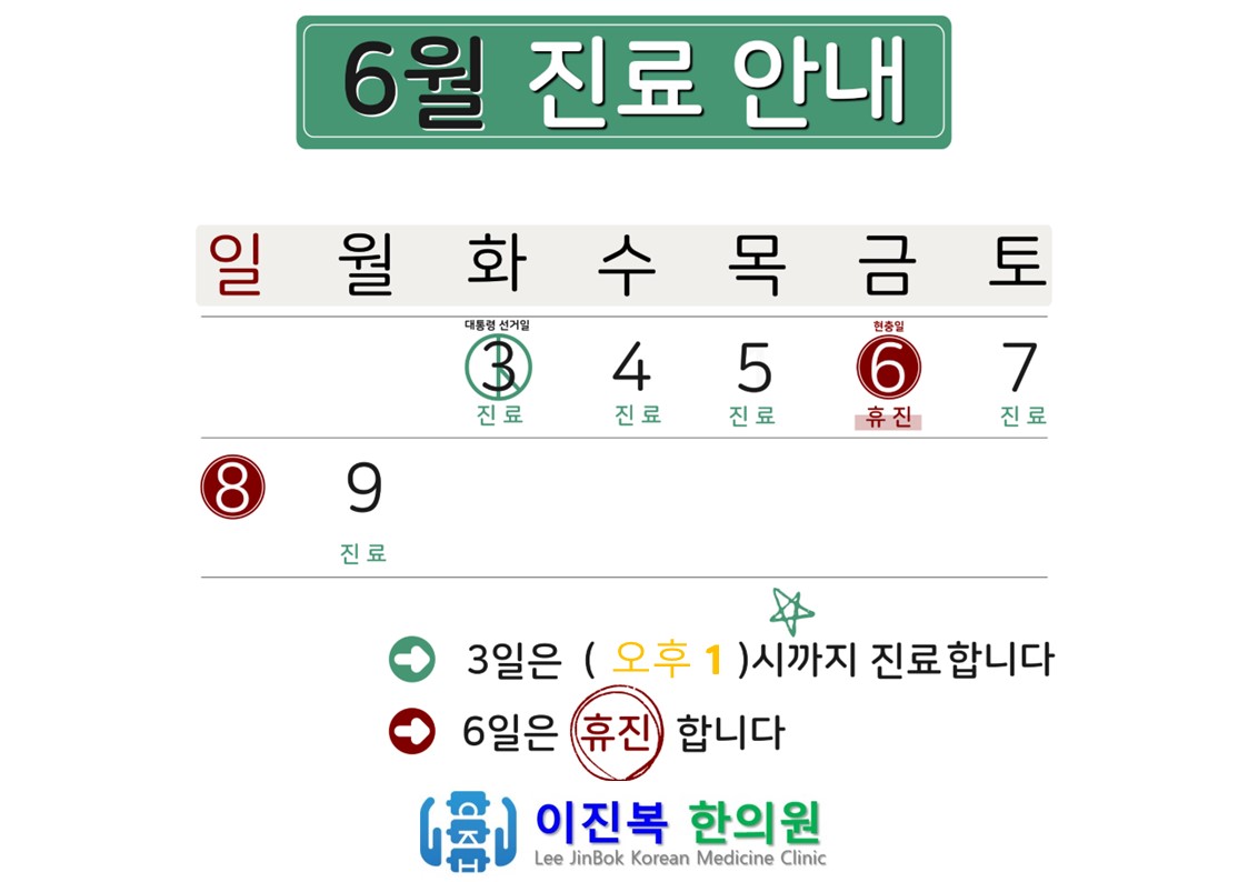 6월 3일 대선일에는 오후 1시까지 점심시간없이 진료하고, 6일 현충일은 휴진합니다.