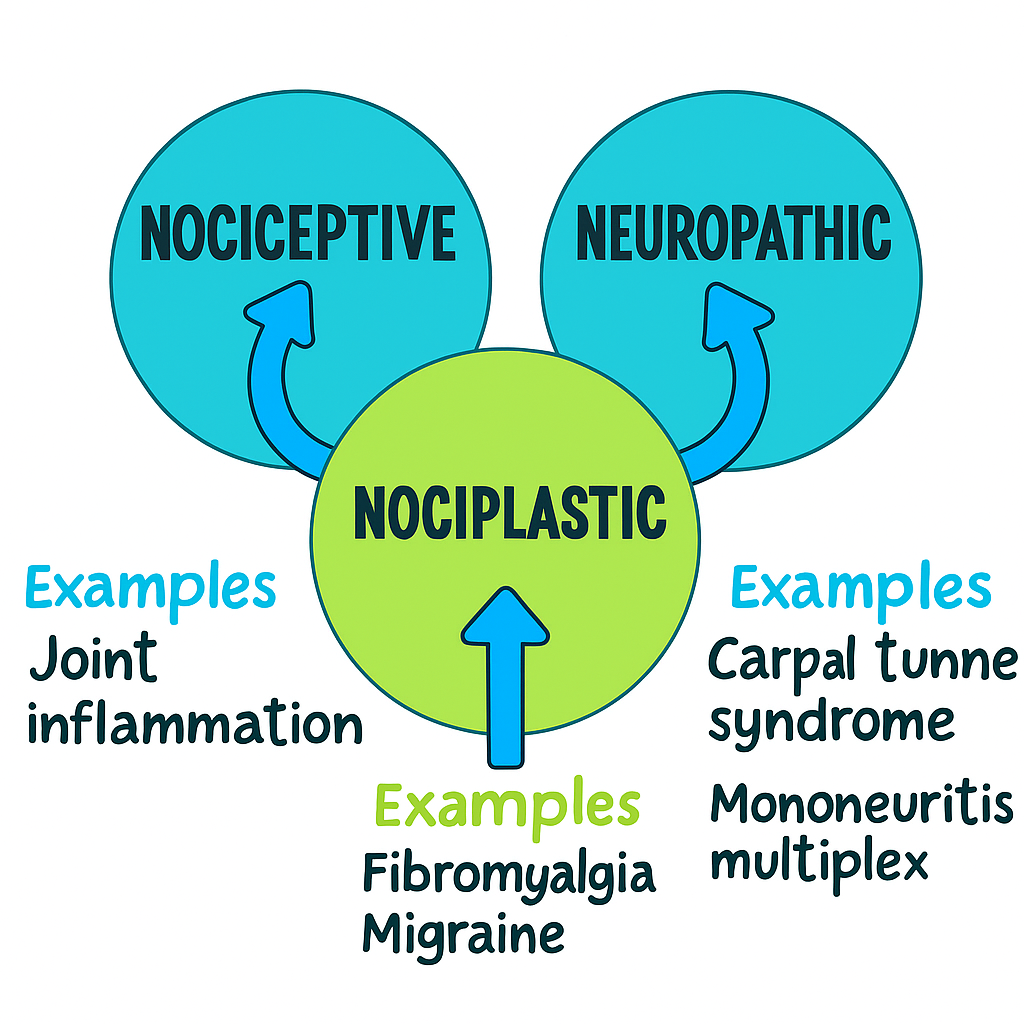 침해가소성 통증인 Nociplastic pain으로 구분될 수 있습니다.