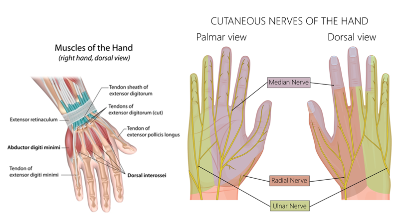 - 통증 부위(손등, 1-3번 손가락)는 <요골신경(천층요골신경)>이 담당하는 감각 영역과 일치합니다.