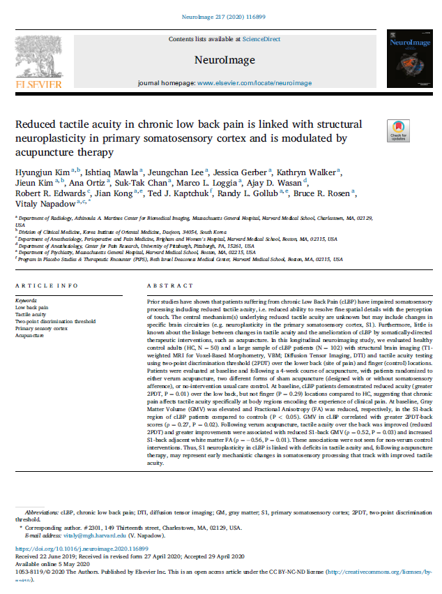 4주 6회의 치료 후 피험자의 뇌 구조를 관찰한 결과, 진짜 침 치료군만 허리감각이 회복되면서 허리영역의 회백질 부피가 함께 줄어드는 것으로 확인됐으며, 또한 확산텐서영상(DTI)를 이용해 만성요통 환자의 뇌백질 구조를 살펴본 결과에서는 진짜 침 치료 후에만 허리감각이 회복되면서 허리영역 뇌백질 구조 이상도 회복되는 것으로 확인됐다.