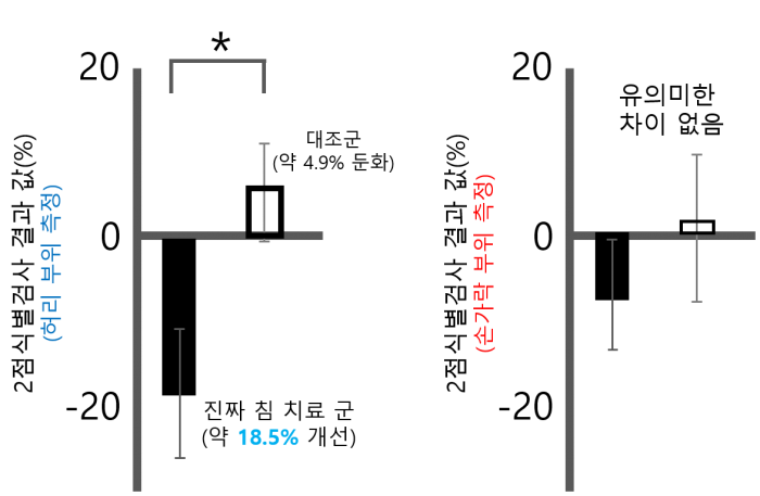 4주간 총 6회에 침 치료를 실시했으며, 치료 전·후 전체 피험자 대상으로 허리부위 촉각예민도를 측정하는 2점식별검사를 수행한 결과, 진짜 침 치료를 진행한 실험군은 치료 전보다 촉각예민도가 약 18.5% 개선된 것으로 나타난 반면 가짜 침 치료군 및 일반치료군은 촉각예민도가 약 4.9% 둔감해진 것으로 나타나 진짜 침 치료만 만성요통으로 인해 둔감해진 허리부위 감각을 회복시킨다는 것을 확인했다. 더불어 동일 실험을 통증과 상관없는 손가락에서 시행한 결과에서도 치료 전·후 2점식별검사 값의 유의미한 변화는 없었으며 진짜 침 치료군과 대조군 간의 차이도 없는 것으로 나타났다.