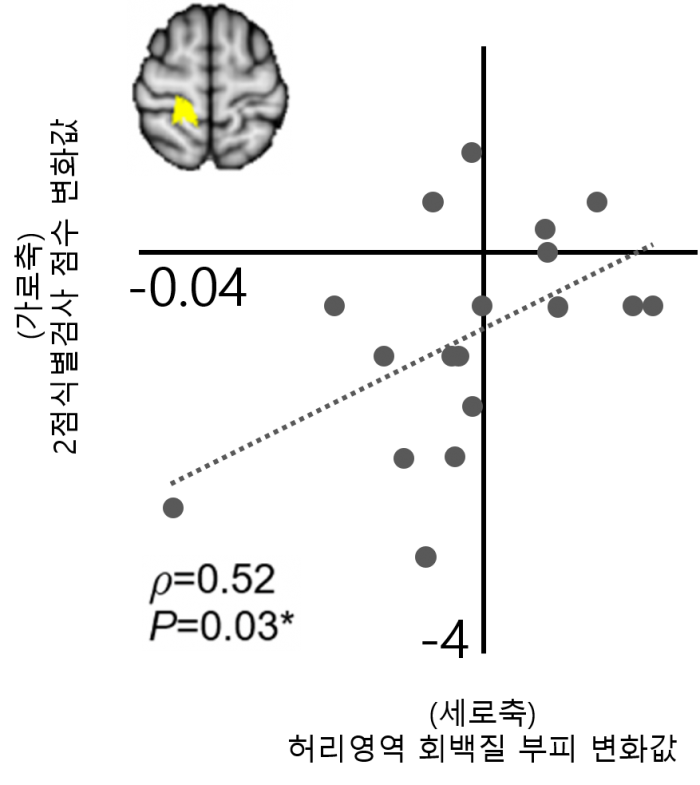우선 fMRI를 이용해 허리 자극시 뇌의 일차감각피질에서 활성화되는 영역(이하 허리영역)을 획정한 연구팀은 T1 강조영상을 통해 허리 감각이 둔해질수록 허리영역의 회백질 부피가 증가한다는 것을 확인했다.