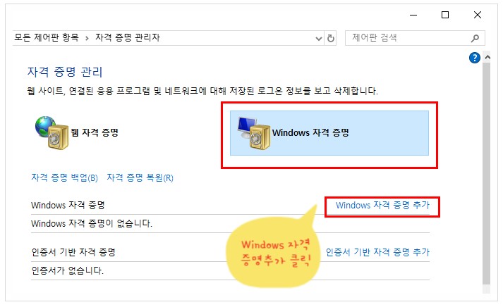 제어판\모든 제어판 항목\자격 증명 관리자\Windows 자격 증명을 클릭하시고