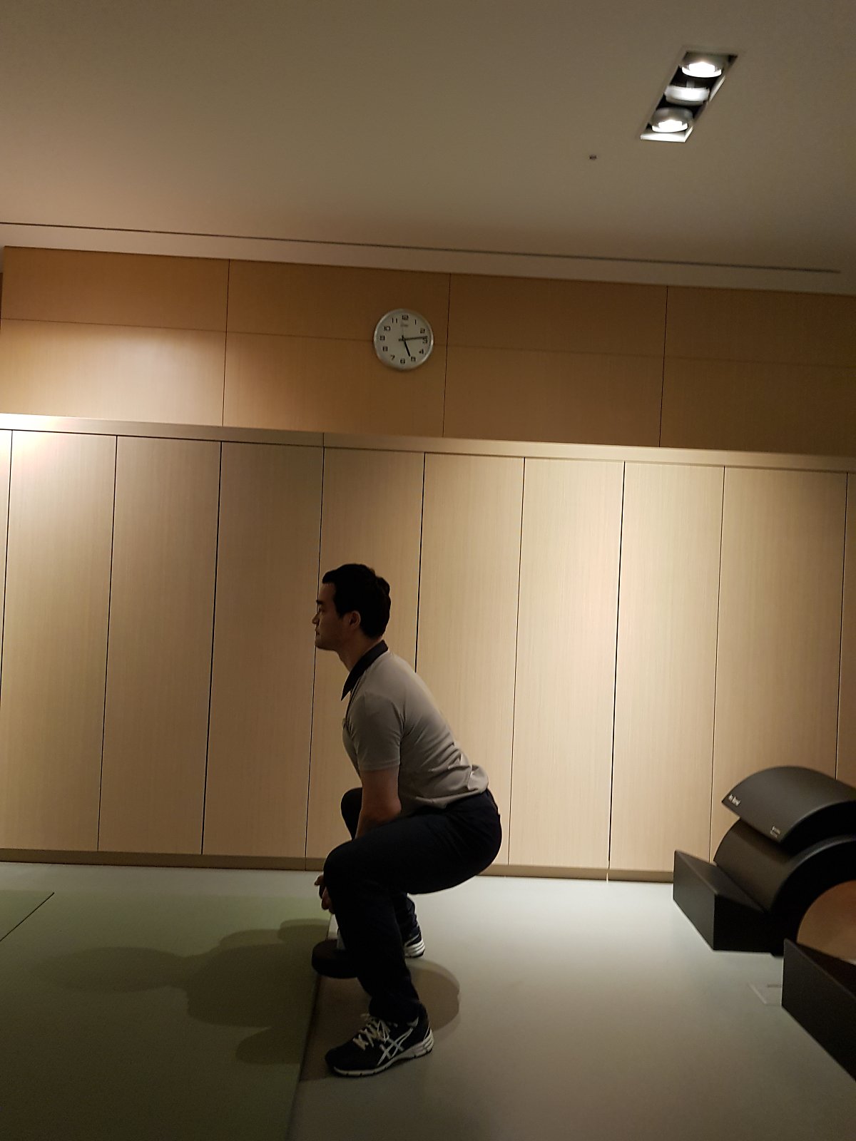 먼저, 발을 엉덩이보다 약간 넓게 벌리고 선 다음, 발가락이 45도 바깥을 향하게 합니다. 가슴은 전방을 향하고 두 손을 깍지 껴 모은 뒤, 허벅지가 바닥과 평행이 될 때까지 엉덩이를 천천히 낮추면서 앉았다가 일어나면 됩니다. 호흡은 앉을 때 들이쉬고, 일어날 때 내쉽니다. 20회를 1세트로 하여 3세트를 시행합니다.