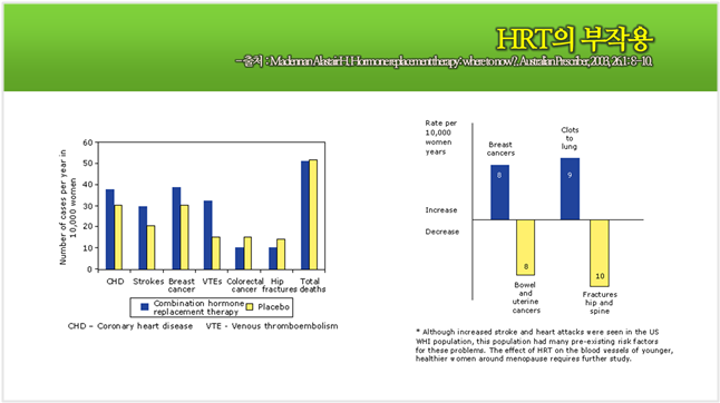 호르몬제는 당연히 부작용이 있을 수밖엔 없죠. 과거에는 아무 의심 없이 호르몬 치료를 받았다면 최근에는 HRT의 부작용이 대중들에게도 어느 정도 알려지면서 호르몬 치료를 꺼리는 경우도 많이 생겨났습니다. 2002년 WHI라고 알려진 임상실험에서는 제약업체와 의사들이 믿은 것처럼 HRT가 심장질환을 막을 수 있는가의 여부를 조사하기 위해 대규모 연구를 진행했습니다. 하지만 놀랍게도 정반대의 결과가 나타났죠. 에스트로겐과 프로게스테론 복합 요법이 심장마비와 뇌졸증의 위험을 증가시킨다는 사실이 발견되었고, 유방암에 걸릴 위험이 높다는 사실도 발견하였습니다. 2007년 <Lancet>에 실린 연구에서는 1991년에서 2005년 사이에 HRT요법은 난소암을 일으켜 1,000명의 여성들이 사망했을 것이라고 주장하기도 했죠.
