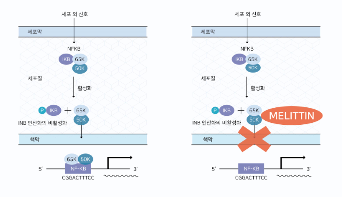 NF-κB는 염증을 유발하는 유전 신호 중 하나이다. NF-κB가 인산화되면 핵 안으로 들어가서 염증 신호를 개시하는데, 멜리틴은 NF-κB가 핵 안으로 들어가는 것을 막아서 염증 신호 발생을 억제한다.