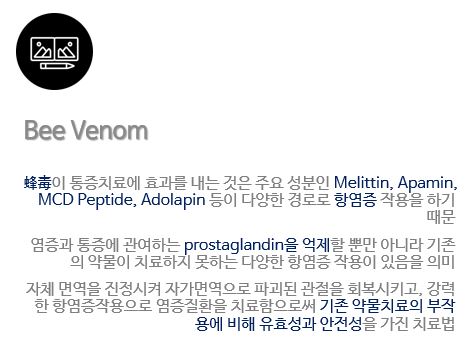 저 역시 개인적으로 봉독을 많이 활용하고 있는데, 포인트를 ‘통증의 화학적, 신경적 조절’과 면역학적 관용(immune tolerance, self tolerance)을 유발하는 데에 두고 있습니다.