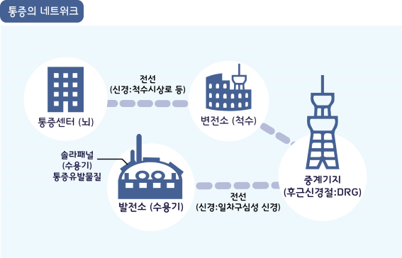 불쾌한 통증은 우리 몸을 지키기 위한 중요한 방어 시스템의 하나로 몸의 이상을 알려주는 경고 신호이다. 조직이 손상되면 통증유발물질3이 분비되어 수용체라는 센서에 감지되고, 다시 수용기라고 불리는 발전소와 같은 부위에서 전기적인 신호로 변환되어 신경을 통해 척수로 전달된다. 척수에서 집약된 전기신호는 시냅스라고 불리는 부위에서 신경전달물질을 통해 집약, 선택, 분산된다. 정리된 정보는 다시 전기신호로 변환되어 통증감지센터인 뇌로 최종 전달되고 뇌는 통증을 인지하게 된다.