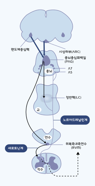 세로토닌 계와 아드레날린 계로 나눠지는데 중뇌 청반핵(local coeruleus nucleus)에 기시하여 척수 후각에 분포하는 하행성 아드레날린 경로는 통증의 전달과 변조에 중요한 역할을 하는 것으로 알려져 있다. 이 중 α1-아드레날린 수용체는 통증항진에, α2-아드레날린 수용체는 통증억제에 작용한다. 또, 세로토닌은 통증은 억제시키는 쪽으로, 기분은 흥분시키는 쪽으로 작용한다.
