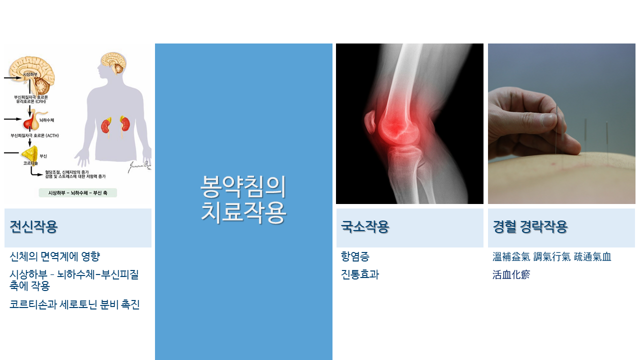 저 역시 개인적으로 봉독을 많이 활용하고 있는데, 포인트를 ‘통증의 화학적, 신경적 조절’과 면역학적 관용(immune tolerance, self tolerance)을 유발하는 데에 두고 있습니다.