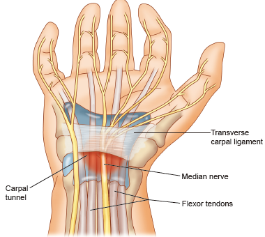 □ 수근관(carpal tunnel)에서 정중신경(median nerve)이 압박되어 생기는 지연성 정중신경 마비입니다. 정중신경 압박, 손목관절의 정중신경 포착 등으로 부르기도 합니다.