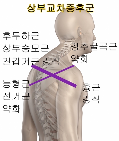 상부교차증후군(upper crossed syndrome), 거북목(forward head posture)과 동반되면서 나타나는 경우가 많습니다.