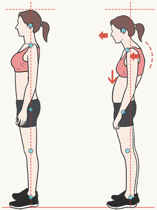 등은 굽고 머리는 앞으로 빠지며 어깨는 전방돌출 되어 좁아 보이는, 구부정한 자세를 취하게 되죠.