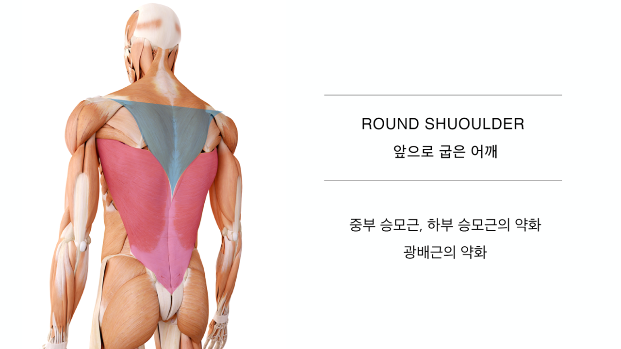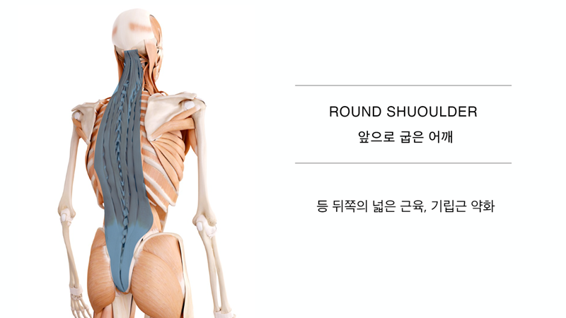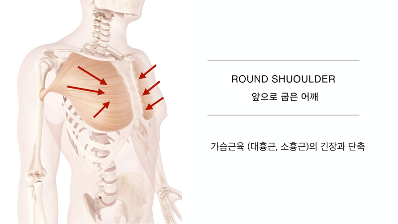 라운드숄더는 팔이 안쪽으로 말린 어깨(거북목, 굽은등동반), 경추의 전만과 흉추의 후만 증가와함께