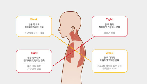 전면의 경추심부굴곡근은 이완되면서 약화됩니다.