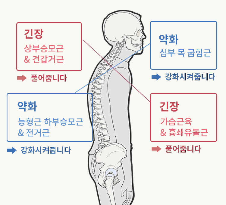 이처럼 만성적 자세 이상은 관절 움직임의 제한과 통증을 유발할 수 있는 원인이 됩니다.