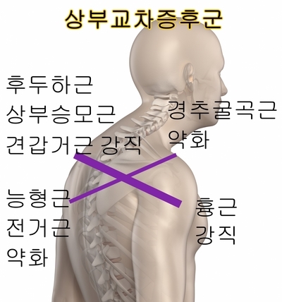 상부교차 증후군(upper crossed syndrome. UCS)은 경추와 견갑대의 만성적인 자세 이상으로 인한 근육 변화의 교차적 패턴을 이르는 것입니다. 임상에서 이런 패턴으로 목과 어깨의 통증을 호소하는 경우가 많고