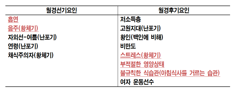 □ 월경후기(月經後期, oligomenorrhea) : 월경 주기가 20일 이상 연장되는 것으로 무월경으로 진행되는 경우가 많으므로 자세한 검사와 지속적 관찰이 필요