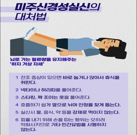 이밖에 박 교수는 생활 속에서 미주신경성 실신에 대한 대처법으로 전구증상이 나타나면 즉각적으로 무릎을 세우고 쪼그려 앉거나 다리를 올리고 누워서 의식을 잃지 않도록 예방하는 것이 중요하며, 이때 앉거나 누워서 전구증상이 호전되더라도 바로 일어나면 실신 증상이 발생할 수 있어 10분 정도 안정을 취한 뒤 일어나야 한다고 조언했다.