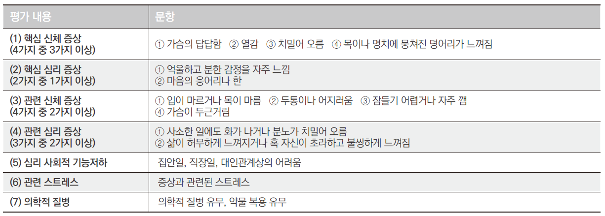 | (1) 핵심 신체 증상 (4가지 중 3가지 이상) |
