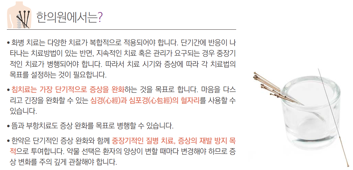 □ 화병의 특성상 치료 종결 이후에도 증상이 남아 있을 수 있고 스트레스에 의해 쉽게 재발되므로 스트레스 원인 제거, 스트레스 대처 전략 등의 교육이 필요합니다.