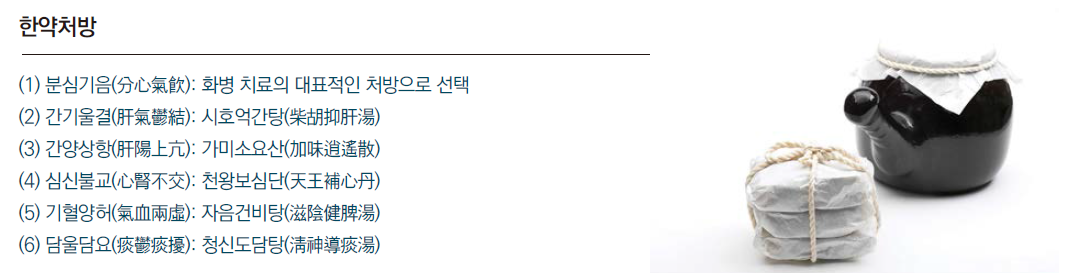 □ 근본적 치료를 위해 상담치료가 동반될 수 있습니다. 환자와의 초기 면담 시에는 화병을 유발하게 된 발병 동기, 이에 대한 환자의 대처방식과 환자의 성격, 주변 사람들과 환자와의 역학관계, 스트레스 사건과 증상과의 관련성 등을 면밀하게 검토해야 합니다.