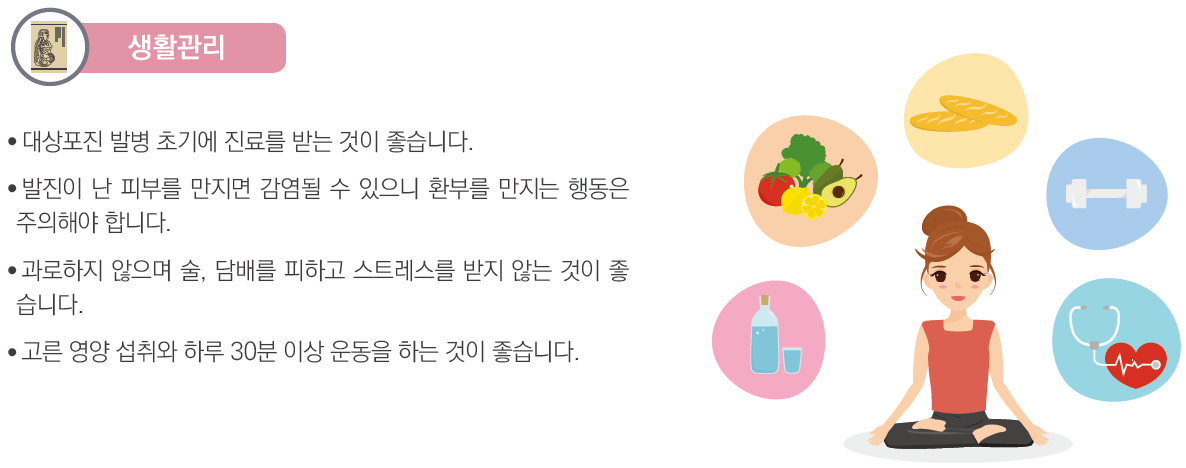 대상포진 바이러스가 잠복해있다 면역력이 저하된 상황을 틈타 재발할 수 있기 때문에 전반적인 몸의 컨디션을 끌어올려 대상포진 재발의 가능성을 줄여야 합니다.