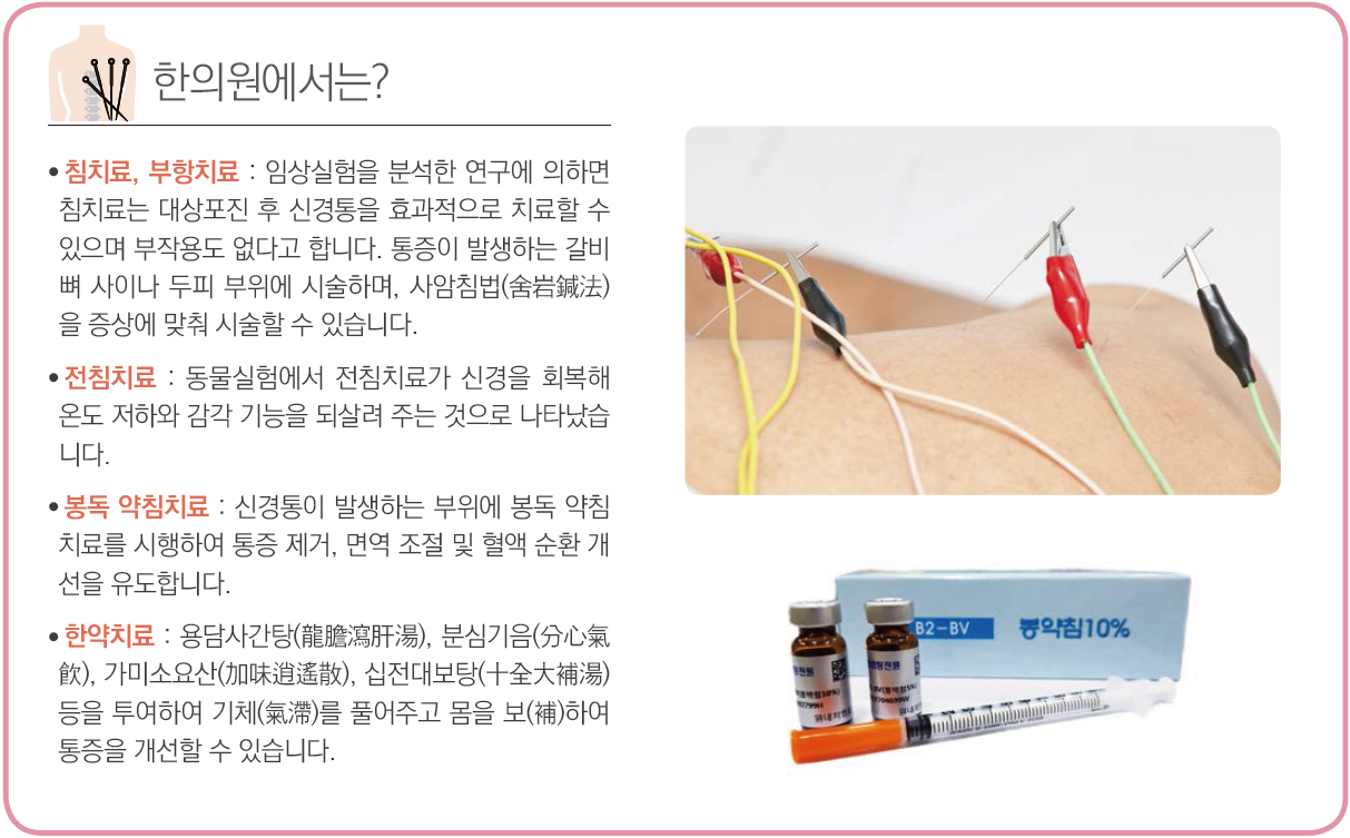 보통 대상포진이 자주 재발하거나 대상포진 후유증으로 신경통이 장기화될 경우에 한방치료를 고려하시고 내원하시는 경우가 많습니다.