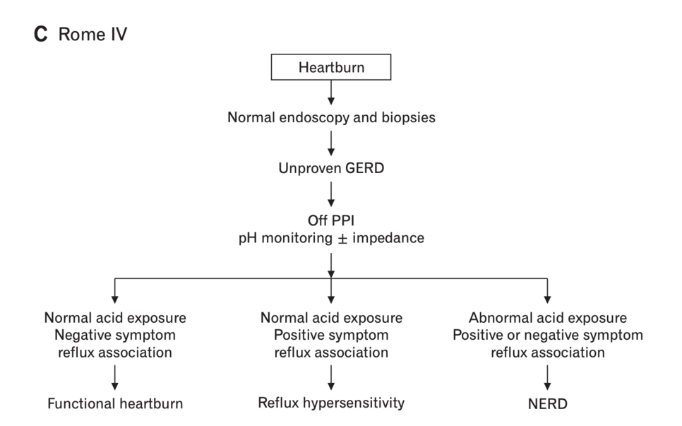 흉부 작열감이 있을 때 1차적으로 PPI를 처방해볼 수 있지만 약물에 대한 치료 반응이 보이지 않는 경우에 다시 위산 노출 여부를 체크해서 구분을 한다는 것입니다. 이 도표에서는 크게 functional heartburn, reflux hypersensitivity, NERD로 세분하고 있는 모습인데요. 임상적으로 아주 뚜렷하게 구분되지는 않을 것으로 생각이 됩니다.