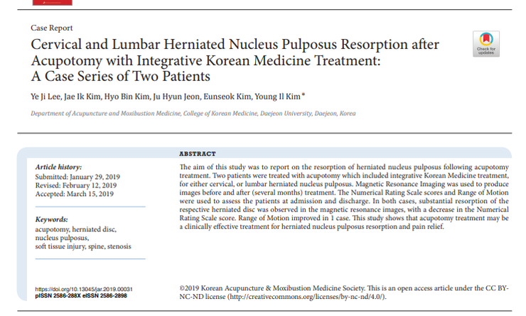 아래의 논문은 목허리 디스크에 도침치료는 경항통과 요통의 개선은 물론 MRI상에서 탈출한 수핵의 재흡수를 확인한 연구입니다