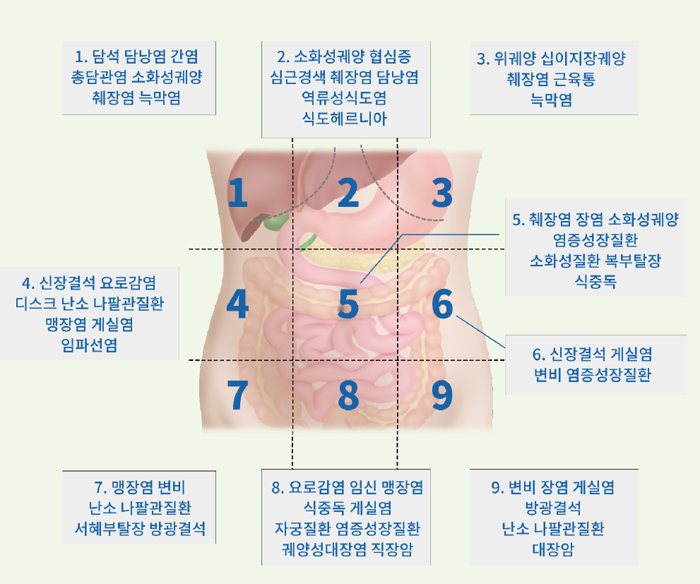 복부를 크게 네 부위로 나누면 우상복부, 우하복부, 좌상복부, 좌하복부로 구분되며, 통증이 있는 부위에 따라 각기 다른 질환을 고려할 수 있습니다. 우상복부의 통증이 심하다면 담낭염이나 간농양과 같은 간담(간, 담낭) 질환을 우선적으로 의심할 수 있습니다.