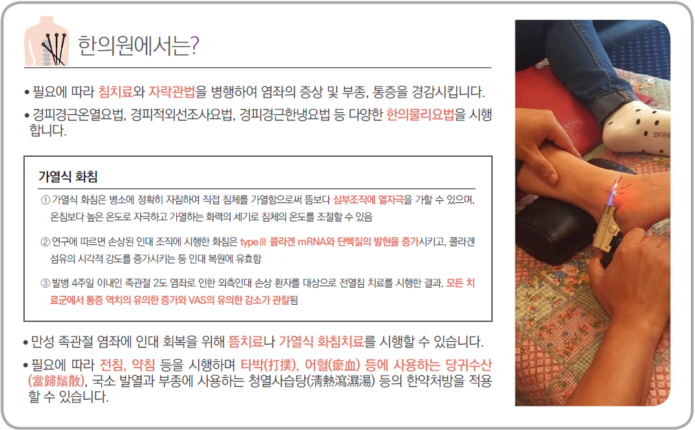 대부분 4~6주 정도 보존적 치료를 시행하면 상태가 호전됩니다. 다만, 적절한 보존적 치료 이후에도 계속해 발목을 접질리거나, 불안정한 느낌과 불편감이 호전되지 않는 만성 불안정성이라면 적절한 한의 치료가 필요합니다.