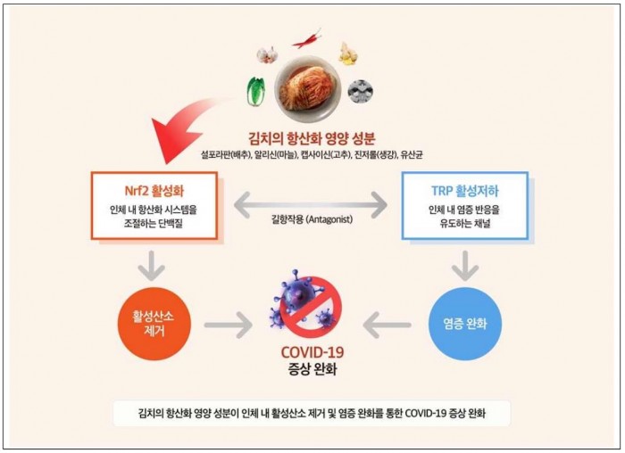 또한 연구팀은 Nrf2와 상호 작용하는 영양 성분은 인체 내 염증 반응을 유도하는 일시적 수용체 전위(TRP)의 활성화와 연관이 있다고 밝혔다. 김치 등 발효 채소나 향신료의 영양 성분이 TRP 채널의 활성을 잃게 만들면서, 코로나19로 인한 염증을 완화하는 효과가 있다는 것.