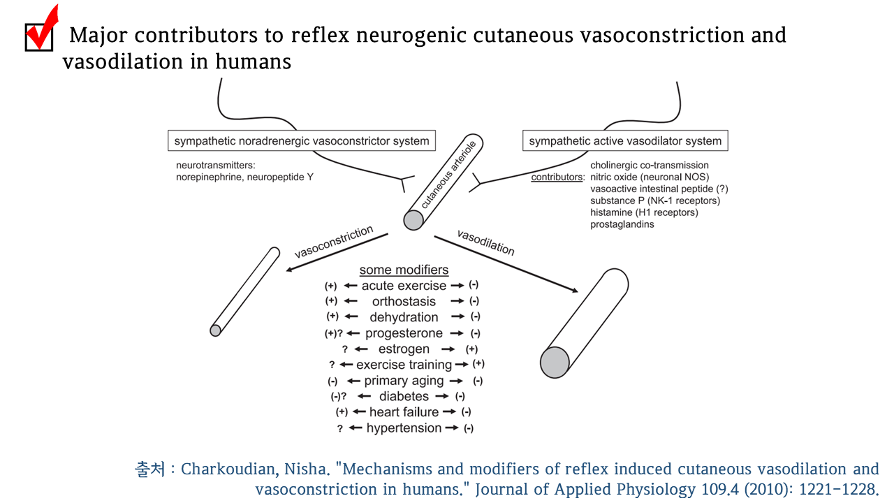 정상적 온도에서는 교감신경성 노르아드레날린성 혈관수축신경이 작용하여 상대적으로 낮은 양의 분당 ~250ml에 해당하는 혈류를 흐르게 합니다. 이 신경이 어떤 이유에 의해서 긴장성 흥분을 발동시키지 못하는 경우 피부혈관은 상대적으로 확장되고 이를 수동적 혈관확장이라 부릅니다. 교감신경에서는 노르아드레날린뿐 아니라 neuropeptide Y도 분비되는데 이 역시 피부혈관을 수축시키는 작용을 합니다. ATP 역시 같이 분비되는데, 이는 세포내 신호전달 경로로서 피부혈관의 수축 반사에 기여하고 노인에서 중요한 역할을 차지하게 됩니다. 반면 고온 자극에서 나타나는 교감신경성 혈관확장신경의 활성화는 능동적 과정입니다. 그밖에도 NO, VIP, Substance P, NK-1 수용체, 히스타민, 프로스타글란딘 등이 혈관확장인자로 관여합니다.