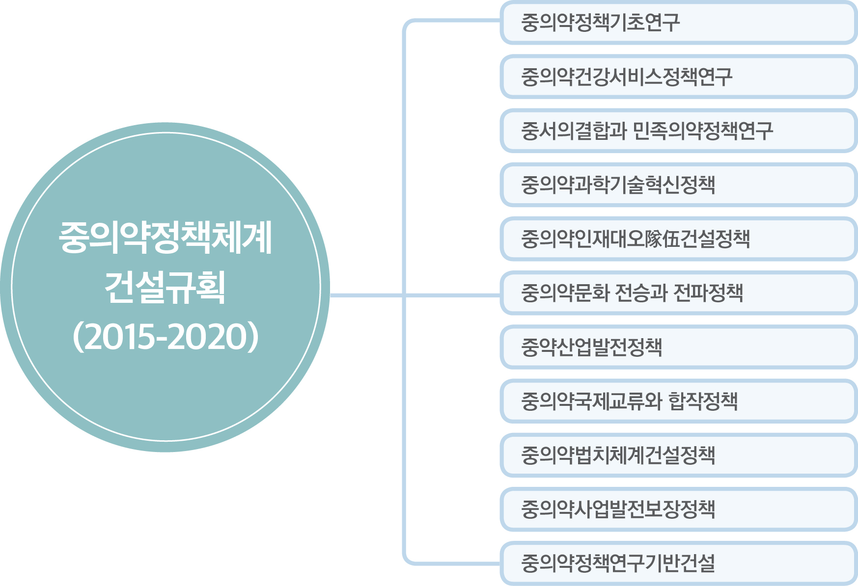 중의약 정책은 중의약 발전을 보장하는 기본적인 요소이다. 최근 전통의학 시장의 급격한 성장과, “일대일로”와 “인터넷+” 등 거시적 국가 전략에 의해, 중의약은 새로운 국면에 접어들었고 발전의 호기를 맞이하였다. 이에 2015년 11월 중국정부는 《중의약 정책체계건설규획(2015-2020)》을 발표하여, 중의약 정책체계를 전반적으로 구축하고, 중의약의 특색을 살릴 수 있는 정책을 연구/실시하여 향후 중의약 발전에 국가적 역량을 집중할 것임을 밝혔다. 중의약 관련 정책시스템이 구축되면 중의약 발전을 위한 중요한 기초가 완성되어 중의약 발전에 큰 역할을 미칠 전망이다.