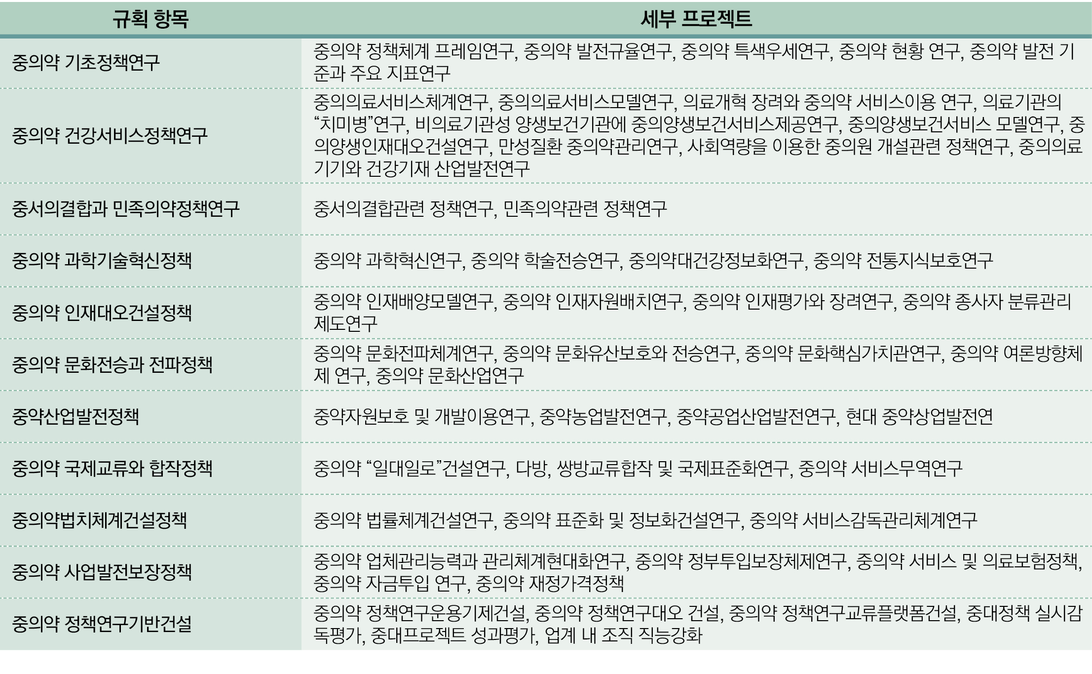 이번에 발표된 규획은 중의약 관련정책/건강서비스/중서의결합과 민족의/과학기술발전/전승과 전파등 11개 항목으로 구성되어 있다. 구체적인 내용은 아래와 같다.