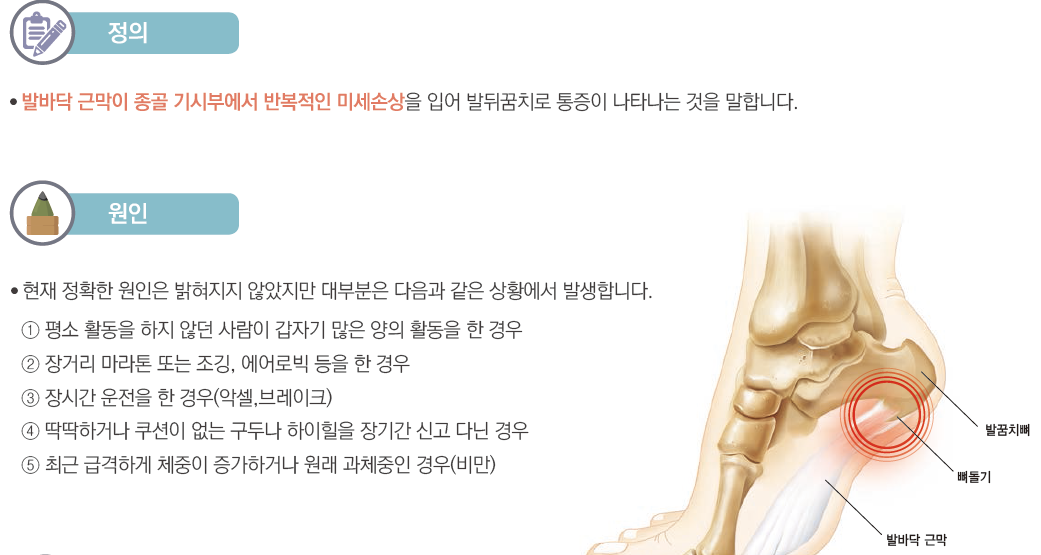 장시간 서있고 많이 걸으시는 분들에게 자주 발생하는 족저근막염에 대해 알아보겠습니다.