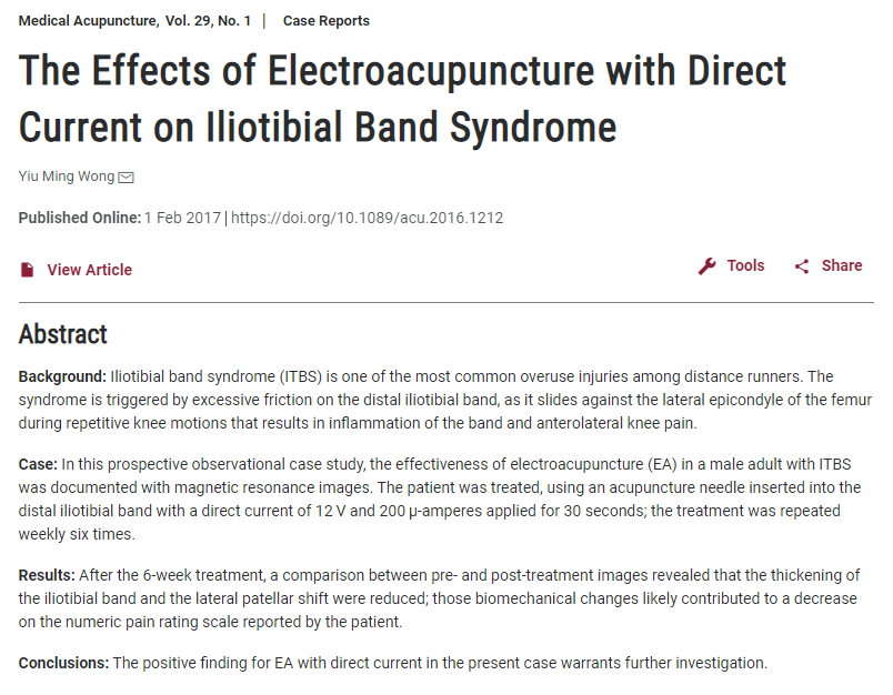 MRI로 장경인대증후군으로 진단받은 남성에게 주 1회씩 전침치료를 시행한결과 통증의 감소와 함께 두꺼워졌던 장경인대의 두께가 감소하고 슬개골의 외측 편위가 감소된 임상증례가 보고된 바 있습니다.