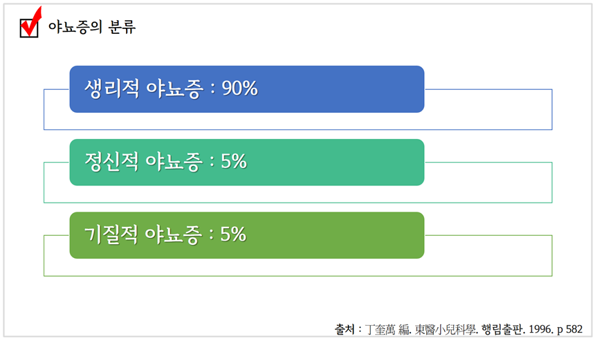 원인적으로 분류하면 생리적(physiologic), 정신적(psychologic), 기질적(organic) 야뇨증으로 나눌 수 있습니다. 그러나 이 세 종류를 명확하게 결정하기 어려운 경우가 적지 않습니다.