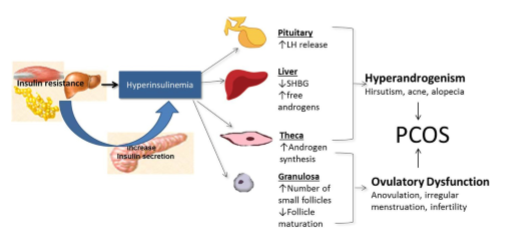 증가된 인슐린 저항성의 영향을 받는다는 인슐린 가설, 난포막 세포에서 성스테로이드 합성 조절에 장애가 생긴다는 난소가설등이 제기되고 있지만 가장 핵심적인 병태생리는 난소의 과도한 안드로겐 합성입니다.