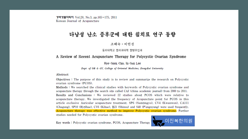 임상증상이 현저하게 호전되고 규칙적인 월경이 3개월이상, 배란이 되거나 임신이 된 경우, LSH/FSH의 비율을 하강시키는 경우를 유효한 경우로 보고 다낭성 난소증후군의 한의학적 치료관련 논문 22편을 분석한 결과 침치료나 한약 치료 단독보다는 한약과 침치료를 병행한 경우의 치료율이 높게 나타났으며, IVF-ET시술 전으로 전침시술을 한 경우에 수정률과 임상 임신률이 대조군에 비해 높았습니다.