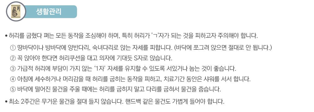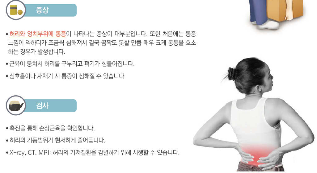 특히, 아침 기상시나, 굴곡 신전시 통증이 극심할 수 있습니다.