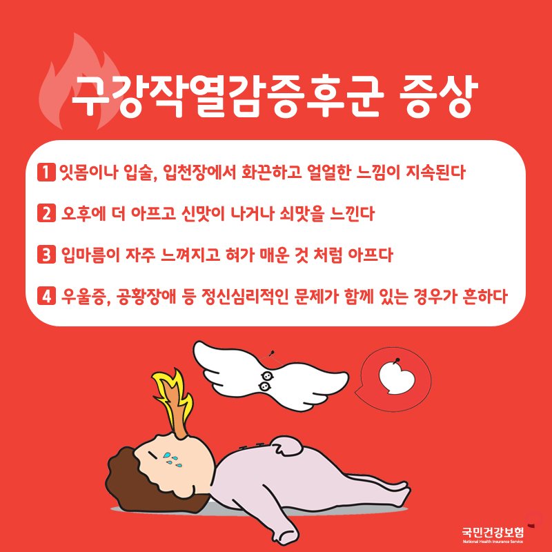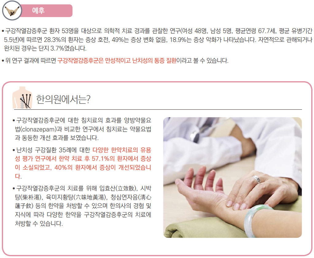 - 구강작열감증후군은 수 개월 이상 매일 발생할 수 있는 입안에서 느껴지는 통증(작열감)입니다.